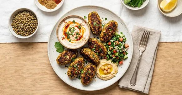 The spice blend here is classically Moroccan — warm cumin, toasted coriander, a whisper of cinnamon, and smoked paprika — but calibrated to be aromatic rather than heavy. Baking the kofta at high heat develops a light crust on the outside while the interior stays almost creamy from the lentil starch. The cool, tangy harissa yogurt cuts through the warm spices perfectly, and a squeeze of lemon brightens the whole plate.