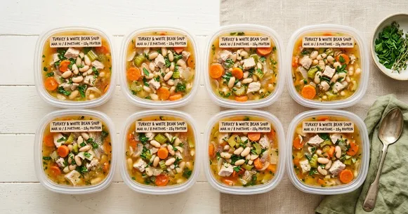 This recipe produces a large pot of ground turkey and white bean soup — dense with protein, gentle on the digestive system, and deeply savory from turkey broth and aromatics. The soup freezes in eight individual portions, which means eight future meals require nothing more than a pot, some heat, and eight minutes. The commitment is one cooking session of about 50 minutes, and the return is two weeks of emergency coverage in your freezer.