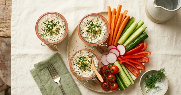 Swap the crudités for what you have. Bell pepper strips, endive leaves, blanched green beans, or sugar snap peas all work as dippers. For a more substantial snack, serve with two or three whole-grain crispbreads — this adds roughly 60 calories and 2 grams of fiber per serving. Endive leaves make an especially elegant vessel if you are packing these for work.