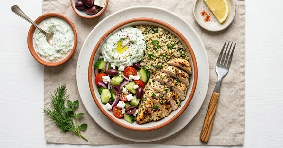 The Greek chicken bowl works on this principle. Instead of a fixed portion, you have marinated chicken, a simple tzatziki sauce, cucumber, cherry tomatoes, and whole-wheat pita or a grain base — all prepped separately, all assembled at the moment you are actually hungry. Some days that is a full bowl. Other days it is two tablespoons of chicken and a quarter of a pita. Both are fine. The components hold for four days in the fridge and never feel like leftovers.