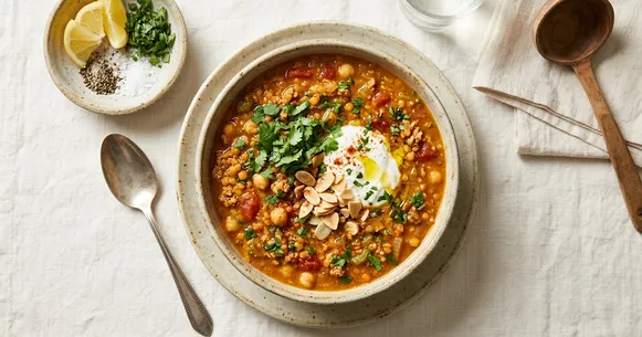 Harira is Morocco's beloved soup, traditionally served to break the Ramadan fast — which makes it a natural fit for breakfast. This version builds layers of warmth from cumin, cinnamon, ginger, and turmeric, all simmered low and slow until the lentils dissolve into a velvety broth and the turkey becomes meltingly tender. A squeeze of fresh lemon and a scatter of cilantro at the table brightens every spoonful.