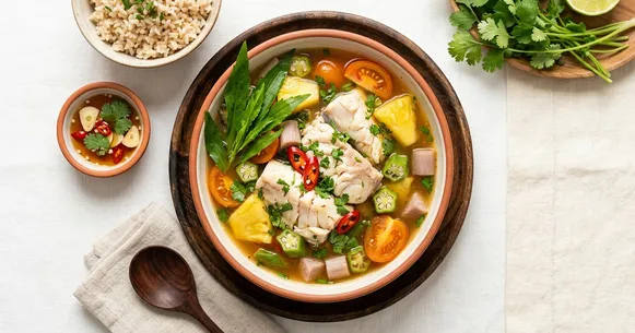 The flavor hits a balance that most Western soups never attempt — sour from tamarind, sweet from pineapple, savory from fish sauce, and bright from a generous handful of fresh herbs piled on at the table. Okra adds a silky body to the broth without cream or starch, and taro root provides tender, starchy bites that make the bowl feel substantial. The overall effect is refreshing rather than heavy, which explains why this soup is eaten year-round in Vietnam even in tropical heat.