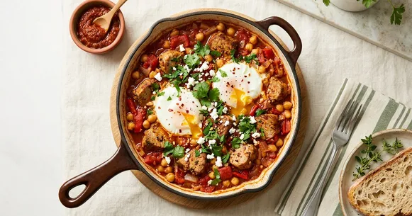 This one-skillet Tunisian breakfast delivers 35 grams of protein per serving by combining lean pork tenderloin with chickpeas and eggs poached directly in the sauce. The base of harissa-spiced tomatoes provides lycopene and vitamin C while keeping calories under 350 per portion. Every macronutrient earns its place here — the pork supplies the bulk of the protein, chickpeas contribute complex carbohydrates and fiber, and the eggs add richness without excess fat.
