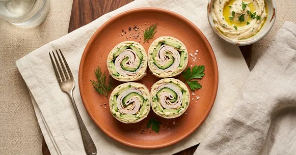 The architecture of the roll-up is simple but deliberate. Sliced turkey breast — the deli or fresh-sliced variety — serves as the wrapper, replacing bread or tortillas entirely. This eliminates carbohydrates while keeping the format recognizable and easy to eat. Hummus spread directly on the turkey provides adhesion, adds chickpea-based protein and fiber, and contributes the fat necessary to slow digestion and extend satiety. Thin cucumber strips add crunch and hydration. Baby spinach provides folate, iron, and a slight bitter note that balances the savory turkey.