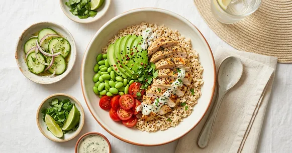 This chicken and avocado rice bowl is designed around that priority. Grilled or poached chicken breast provides the protein base — lean, mild, and versatile. Brown rice supplies sustained carbohydrate energy and a small fiber contribution. Edamame adds secondary plant protein. Avocado rounds the bowl out with monounsaturated fat that slows glucose absorption and contributes to satiety. The tahini-lemon dressing ties everything together with flavor that does not rely on heavy oils or cream.