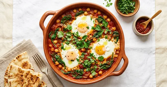 This reheats well for meal prep. Store individual portions of the chickpea-tomato-spinach base (without eggs) in airtight containers for up to 4 days. When ready to eat, reheat the base in a small skillet, create wells, and poach fresh eggs — this adds only 7 minutes and ensures the eggs have the best texture.