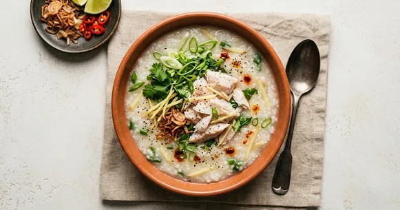 - Ladle the congee into bowls. Top each serving with sliced scallions, cilantro leaves, a pinch of crispy fried shallots, a crack of black pepper, and a lime wedge on the side. Squeeze the lime over the bowl just before eating — the acidity brightens the entire dish.
